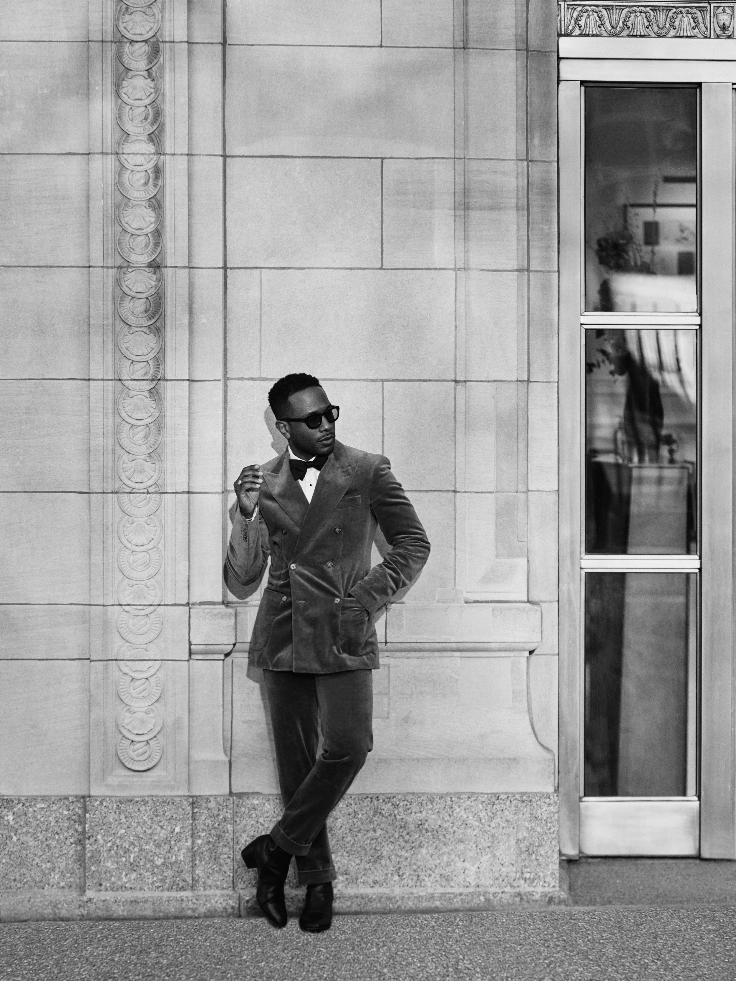 Suit by Institchu; Boots by YSL; Bow Tie by Ermenegildo Zegna; Sunglasses by Moscot.